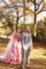 colorful floral printed, a-line gown, waist pleats, high neck halter, bow closure, chapel train